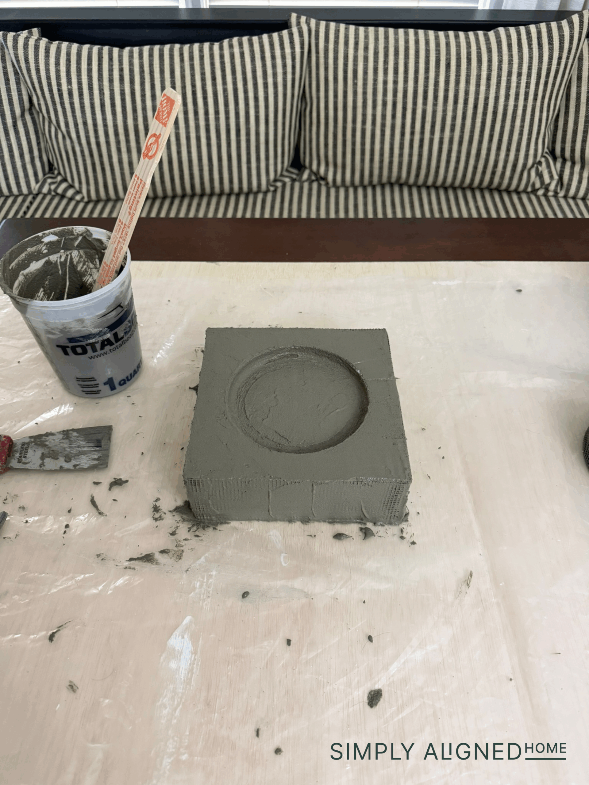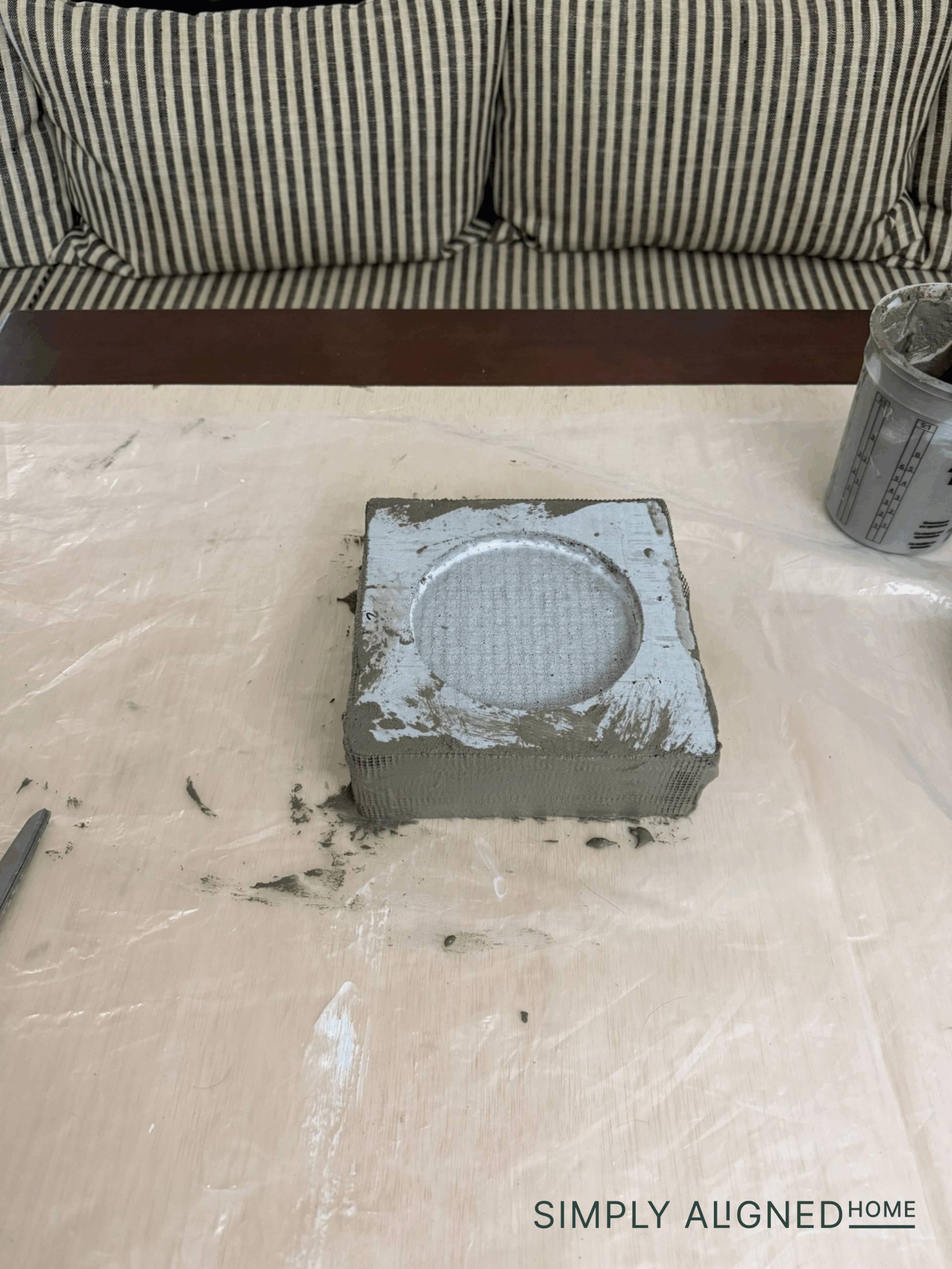 I had leftover mortar from prepping the closet, so I used that to coat the outside of the candle holder. During the first coat, I wrapped mesh tape around the edges to help smooth everything out and give it smoother look.